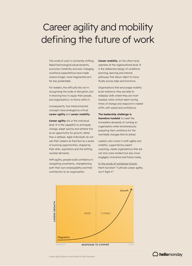 The world of work is evolving rapidly with technological advancements, economic uncertainty and changing expectations redefining careers. Leaders must prepare their people to thrive amid constant disruption by fostering career agility and career mobility.